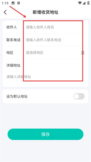 4、依次填写收件人姓名、联系电话、所在地区、详细地址等信息,完成后点击【保存】按钮,完成收货地址的添加。