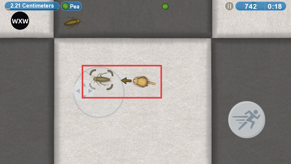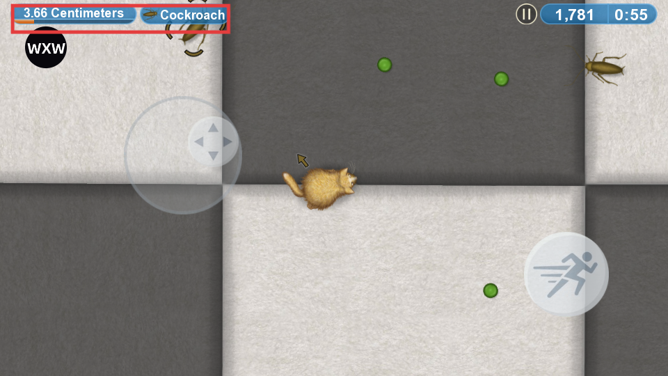 3、控制猫咪移动,吞噬蟑螂等比自身小的生物。