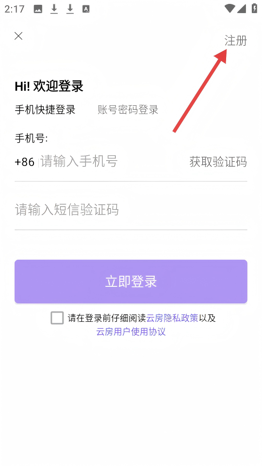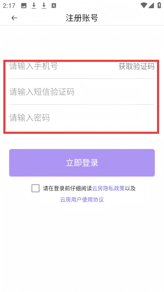 4、在注册账号页面,依次输入【手机号】【验证码】【密码】,勾选协议,点击【立即登录】即可完成注册。