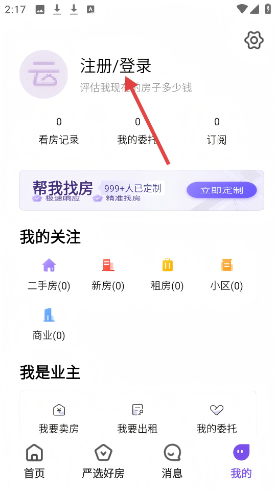 2、在个人中心页面,点击【注册/登录】,进入登录界面。