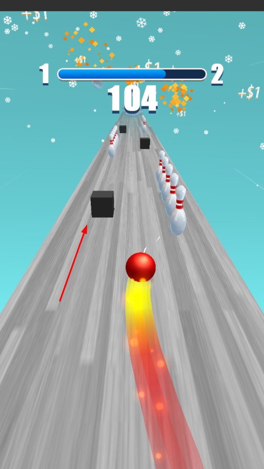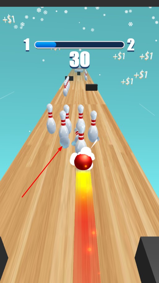 2、在游玩过程,操控保龄球,撞击球道上的保龄球瓶,通过撞击保龄球瓶,获取分数。