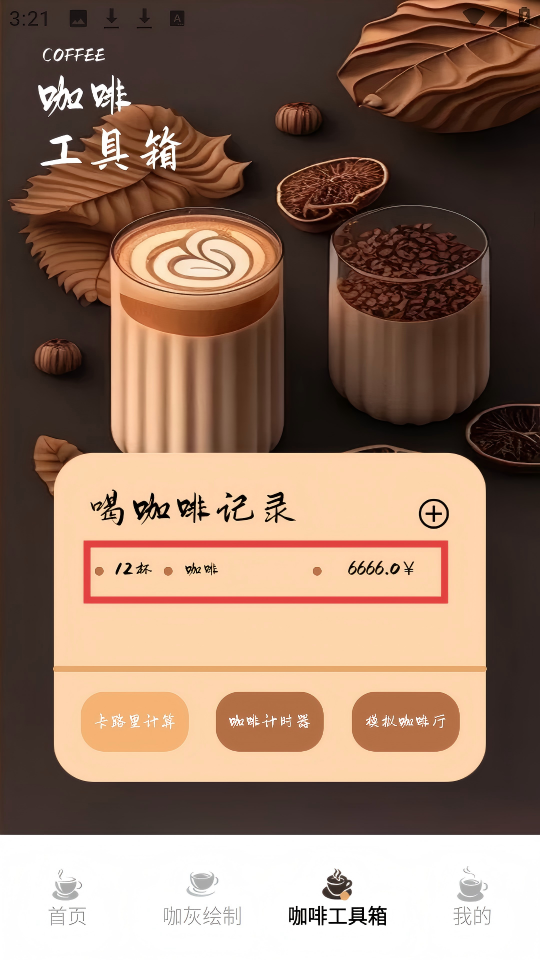 2、在【咖啡工具箱】页面,点击【喝咖啡记录】旁的【+】按钮,可添加喝咖啡记录。