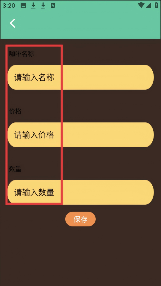 3、在添加记录页面,依次输入【咖啡名称】【价格】【数量】,然后点击【保存】按钮。