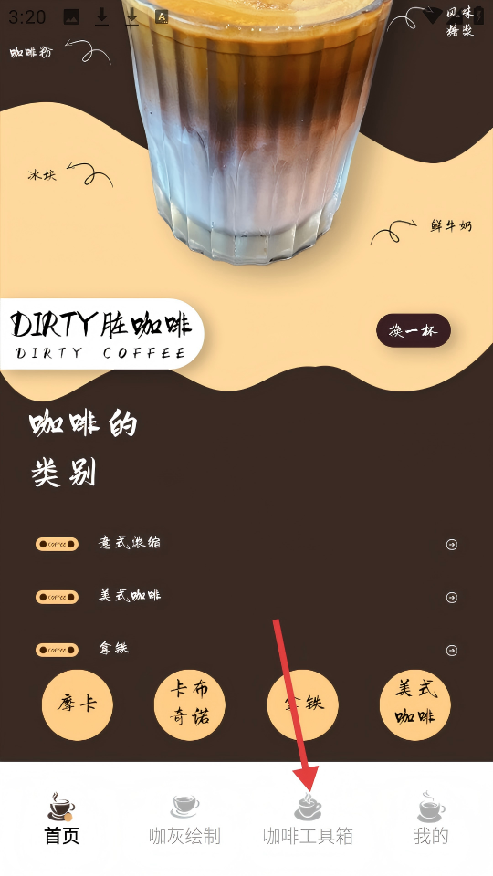 1、进入应用后,点击下方【咖啡工具箱】进入该页面。