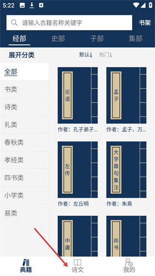 1、在展示【经部】典籍的页面,点击底部导航栏的【诗文】选项,进入诗文相关内容页面。
