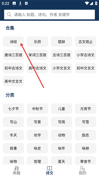 2、进入诗文页面后,找到【合集】板块下的【诗经】选项并点击,进入诗经对应的内容列表页面。