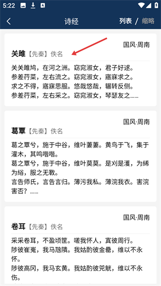 3、进入诗经页面后,点击【关雎】条目,进入该诗文的展示页面,可查看其内容片段及出处信息。