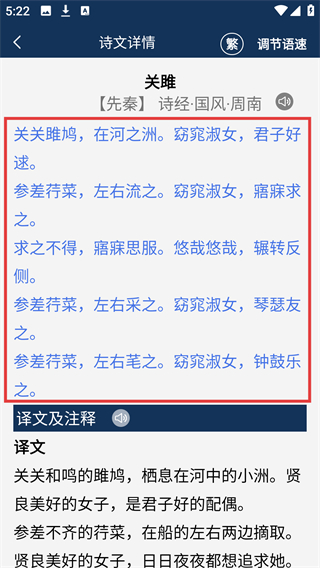 4、进入【关雎】的诗文详情页面,能查看完整诗文内容,下方还有【译文及注释】板块了解其释义。