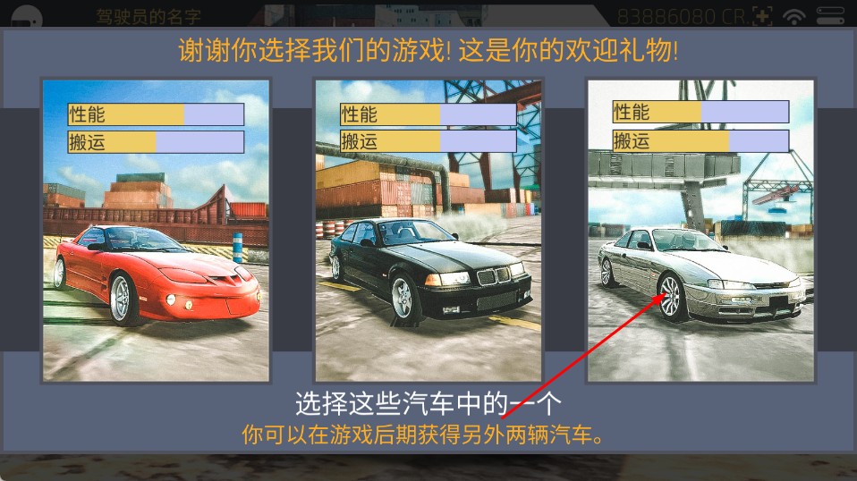 1、从三辆汽车选择一辆作为初始车辆,另外两辆可在游戏后期获取。
