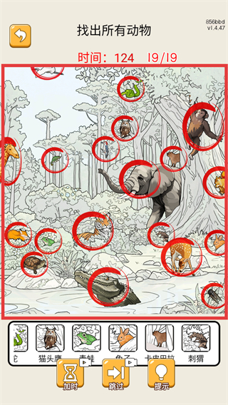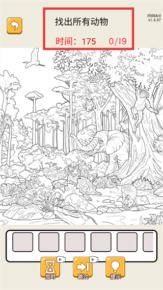 2、进入【找出所有动物】关卡,当前【时间:-175】-【0/19】,需在丛林场景中寻找隐藏动物,可借助道具辅助查找。