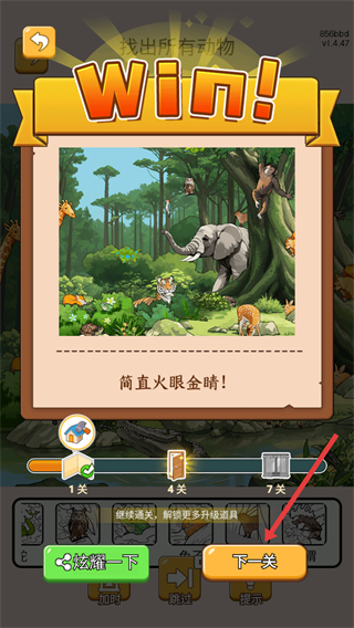 4、通关后获得“简直火眼金睛!”评价,点击【下一关】进入新挑战。