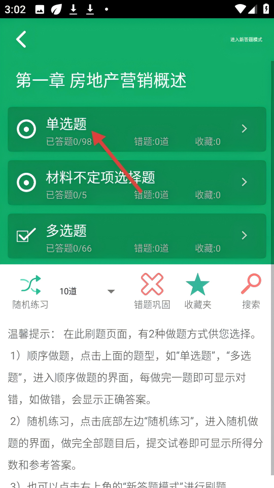 3、在【第一章房地产营销概述】页面,点击【单选题】,可进入单选题答题页面。