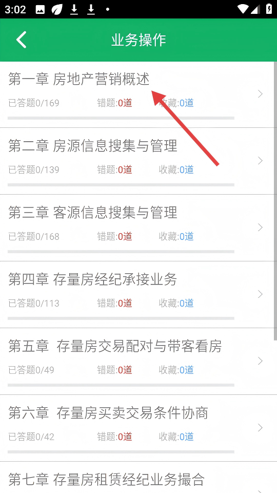2、在【业务操作】页面,点击【第一章房地产营销概述】,可进入该章节的题型选择页面。
