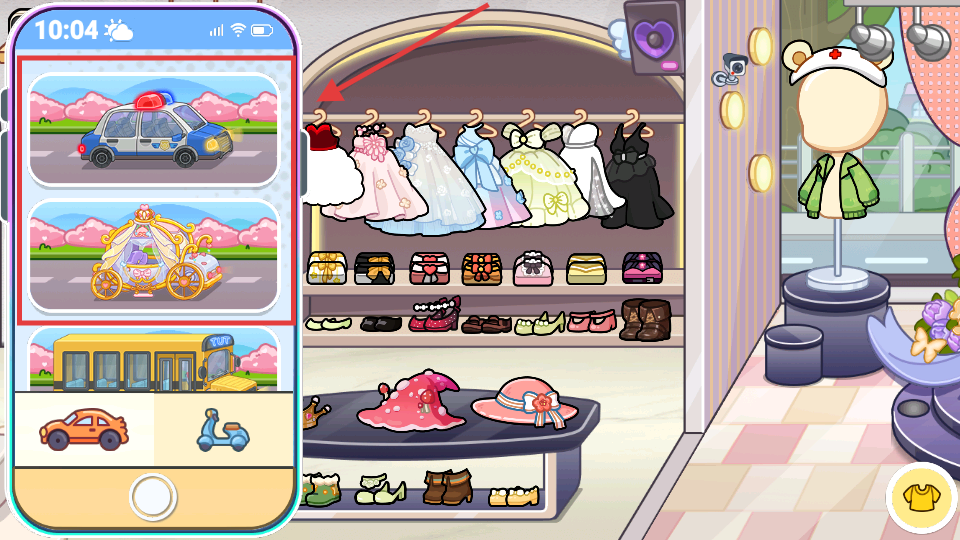 4、通过选择【警车】-【马车】-【校车】等车辆探索小镇,解锁新的服装区域,丰富衣橱,开启更多冒险。