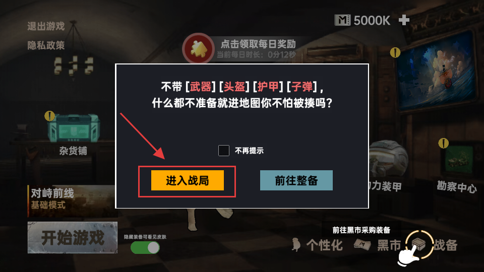 1、未备[武器]-[头盔]-[护甲]-[子弹],可点[进入战局],建议先[前往整备]配齐装备。