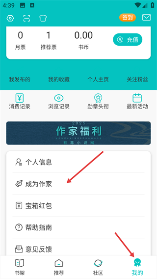 1、在【我的】页面,点击【成为作家】选项。