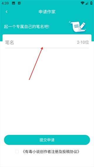 2、进入申请作家页面,根据提示在【笔名】输入框中,填写专属笔名。