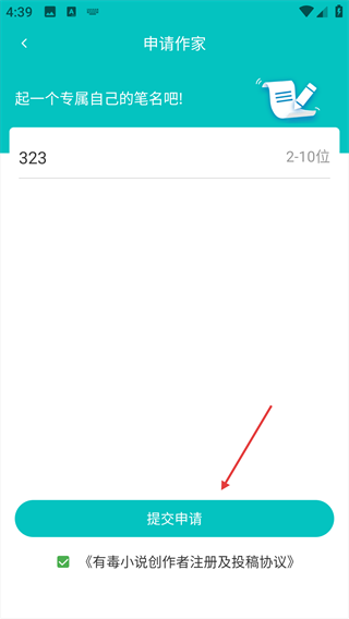 3、填好笔名后,点击【提交申请】按钮,提交作家身份的申请。
