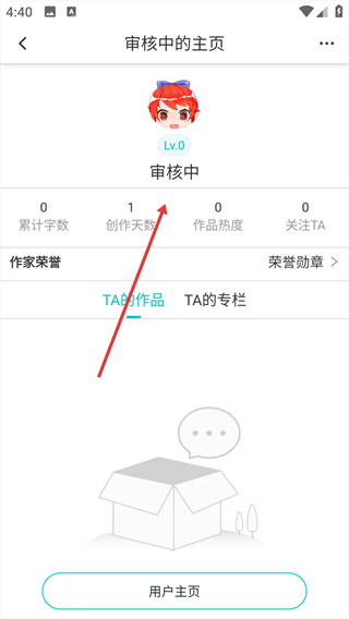 4、提交申请后,进入审核中的主页,页面显示【审核中】状态,等待平台对作家申请的审核结果。