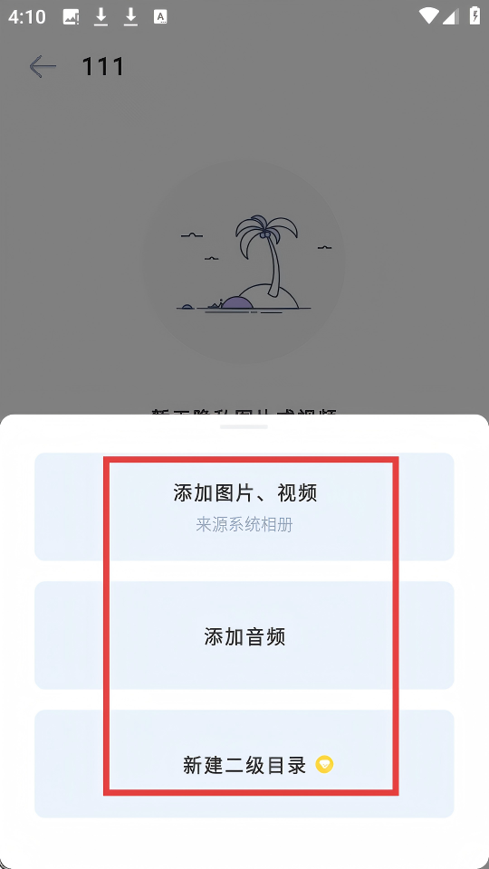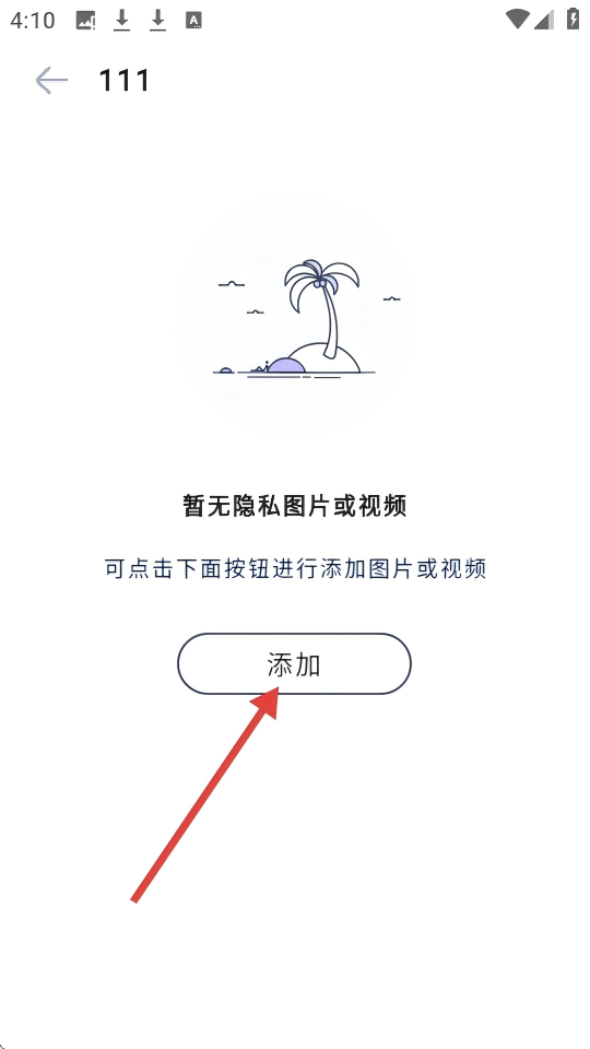 3、在【111】文件夹中,若【暂无隐私图片或视频】,可点击【添加】按钮进行后续操作。