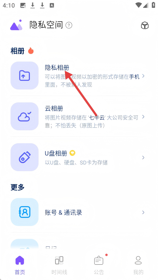 1、在【隐私空间】页面,点击【隐私相册】,可将图片、视频以加密形式存储在手机里。