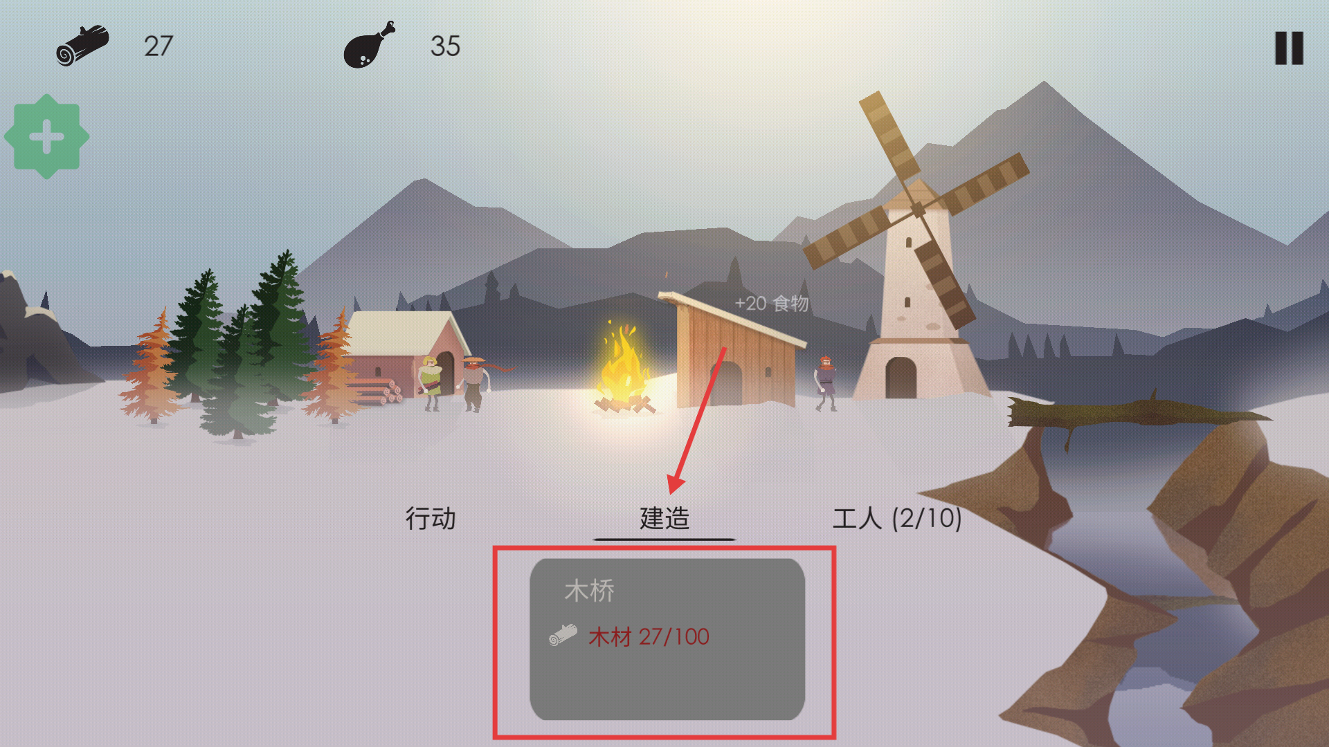 1、建造【木桥】需积累【木材-27/100】,优先收集足够资源,为后续建造做准备,提升村庄发展基础。