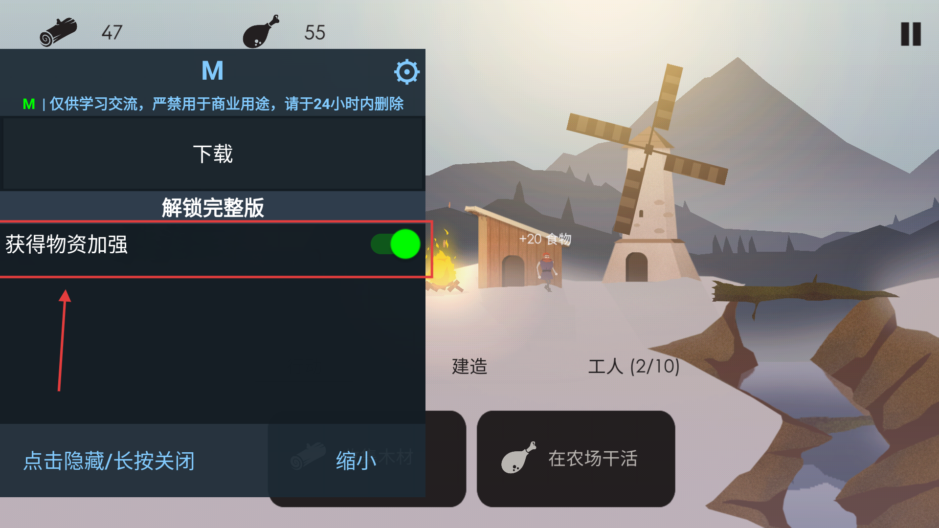 2、开启【获得物资加强】功能,可提升资源获取效率,助力快速积累建造所需的各类物资,加速村庄建设。