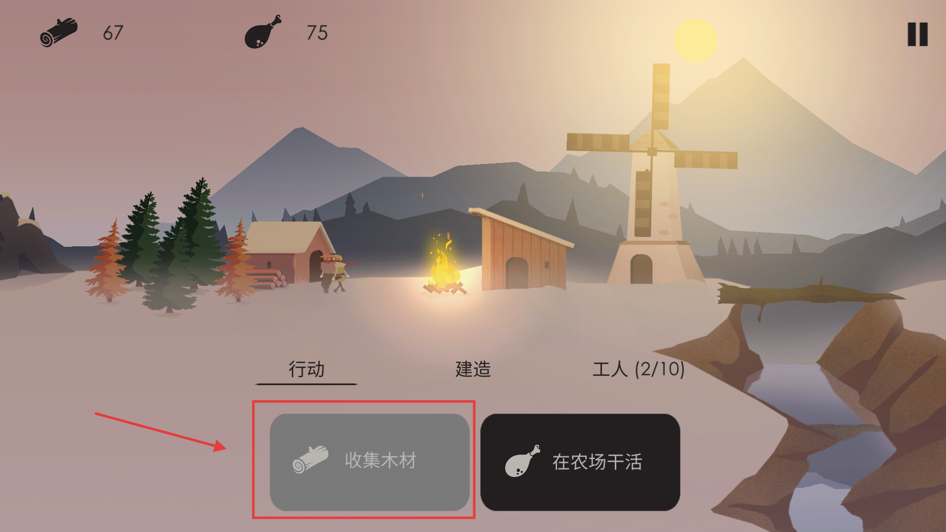 3、点击【行动】栏的【收集木材】选项,安排工人采集木材,持续积累资源,满足建造和升级的需求。