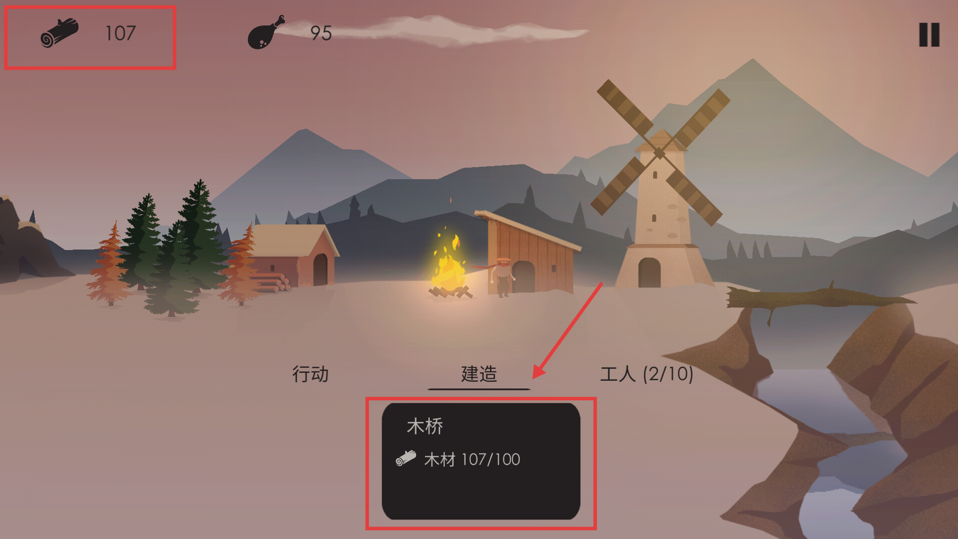 4、当【木材】数量达【107/100】时,进入建造界面选择【木桥】,消耗资源完成建造,拓展村庄区域。