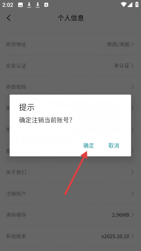 4、在提示弹窗中,点击【确定】,注销当前账号。