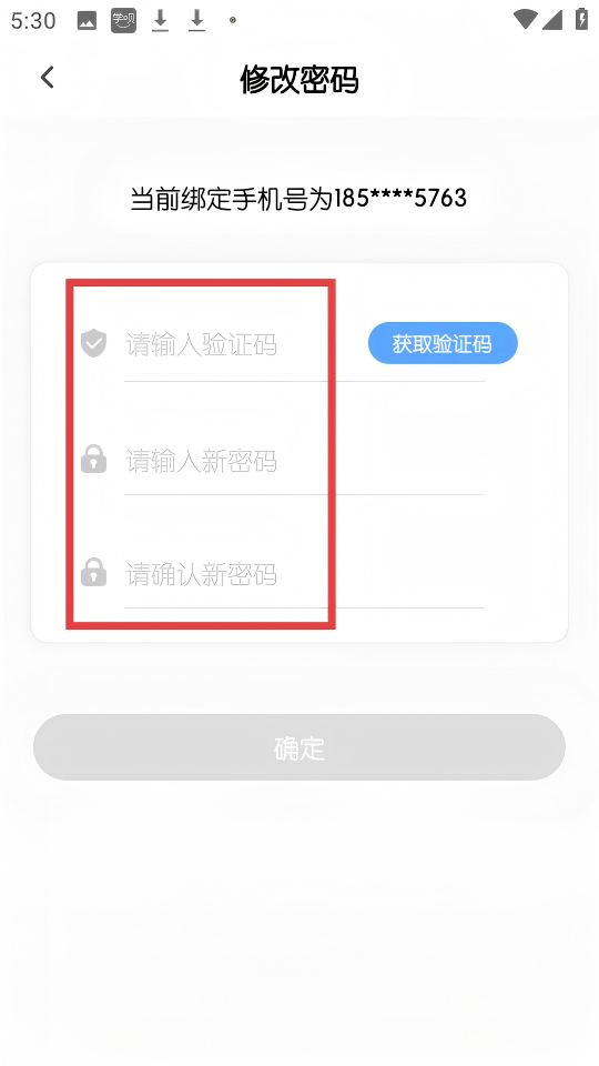 4、在【修改密码】页面,依次输入验证码、新密码、确认新密码,准备完成修改操作。