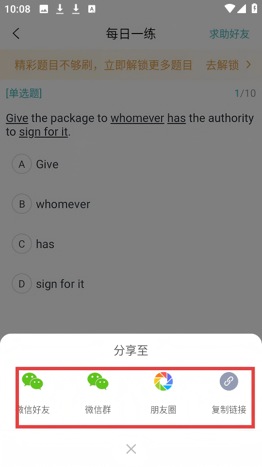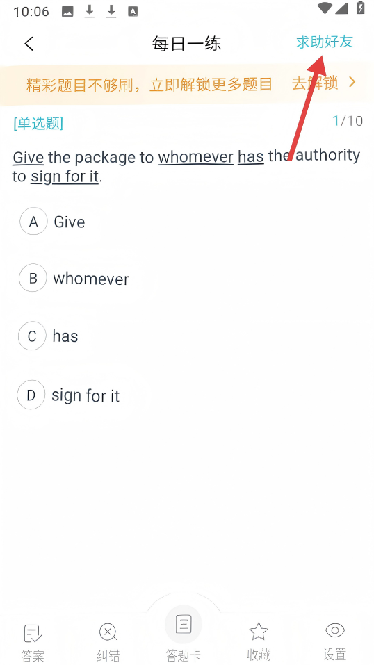 3、在每日一练的题目界面,点击右上角【求助好友】。