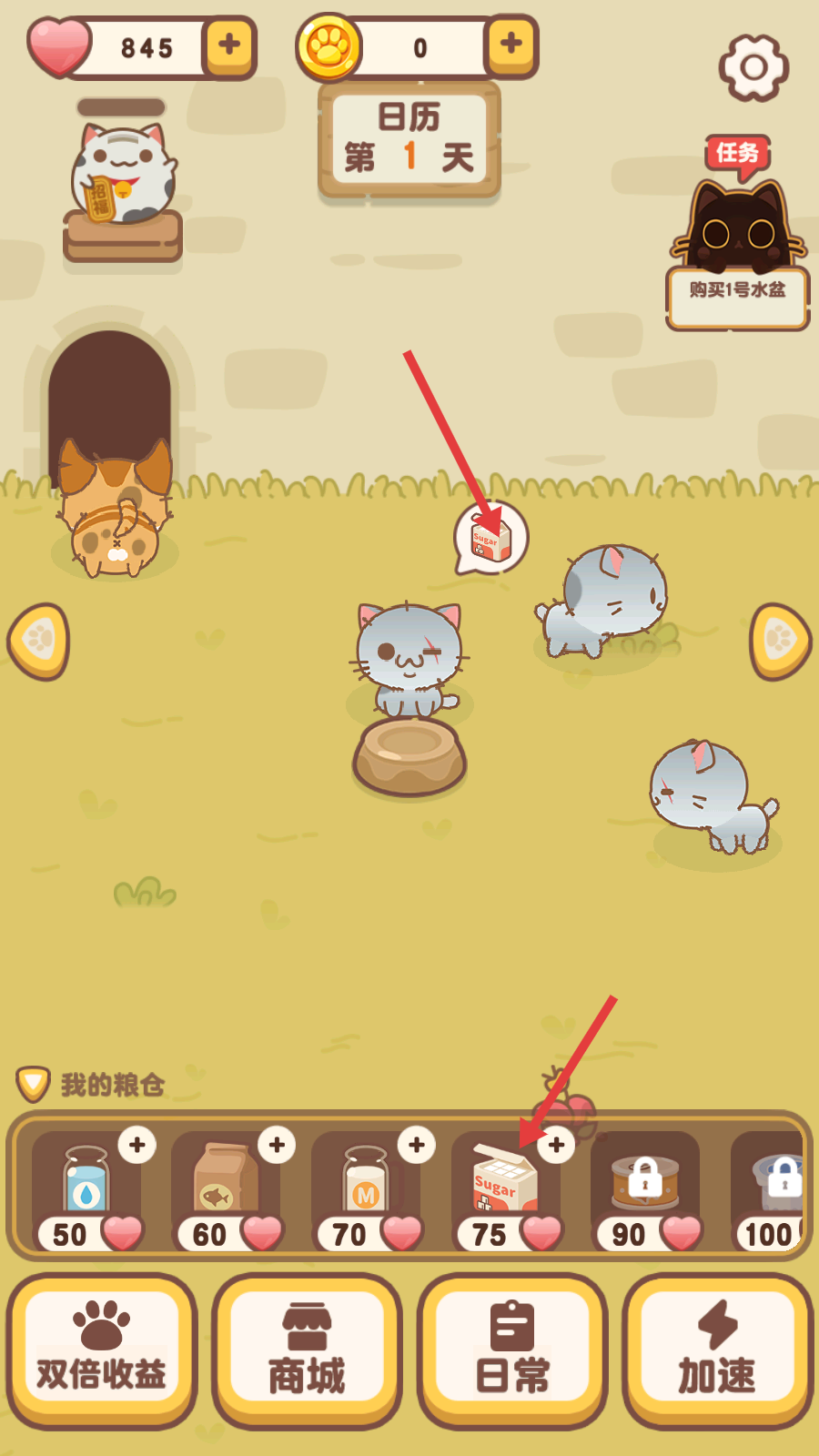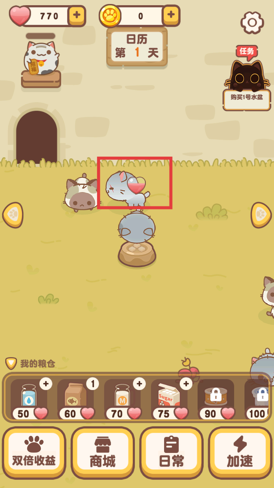 2、根据猫咪需求,从【我的粮仓】中选择对应食物喂食。