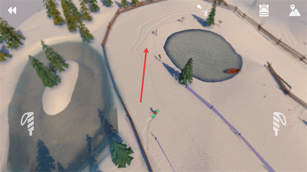 1、按红色箭头指引的路线滑行,控制角色沿雪道前进,避开湖泊区域,保持滑行方向,向目标区域移动。