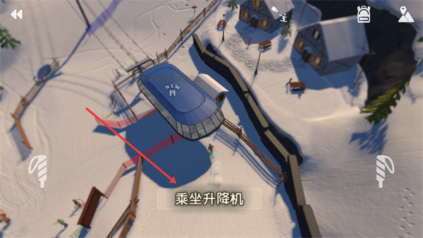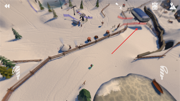 2、继续沿红色箭头指向的方向滑行,穿过围栏区域,靠近缆车与建筑区域,推进至下一目标点。