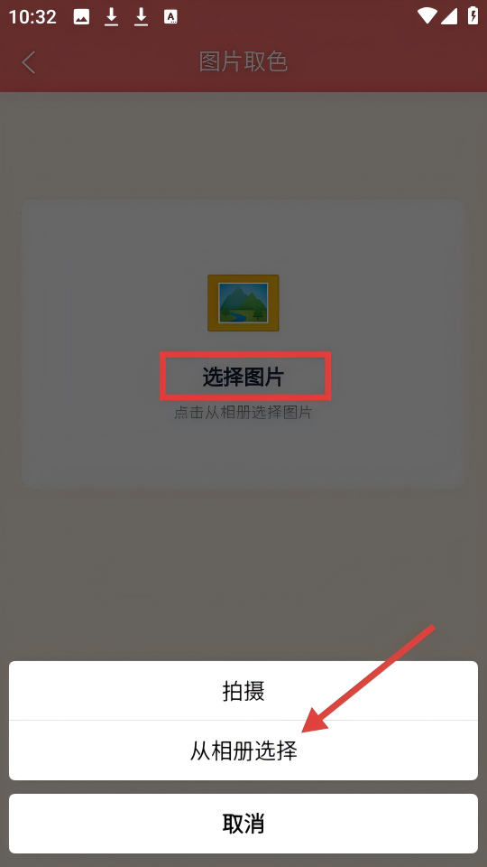 2、进入图片取色页面后,点击【选择图片】再点击【从相册选择】图片。