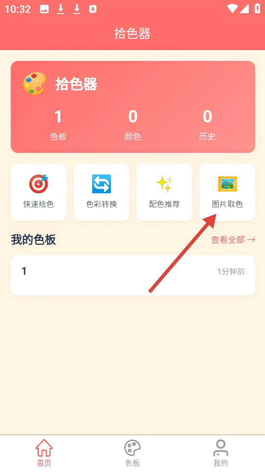 1、进入软件,在拾色器首页,点击【图片取色】按钮。