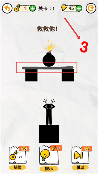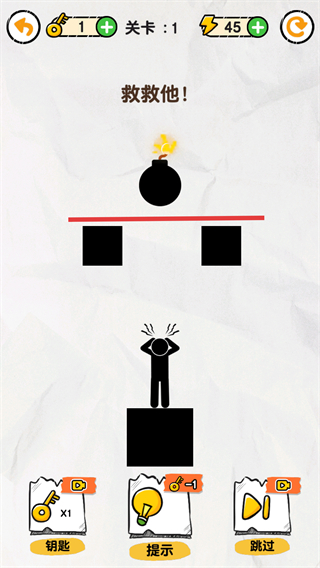 2、进入【关卡:1】,场景显示炸弹在火柴人上方,根据红线进行绘画阻挡炸弹。
