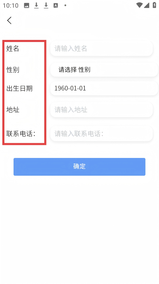 4、在个人信息页面,依次填写【姓名】【性别】【出生日期】【地址】【联系电话】,然后点击【确定】。