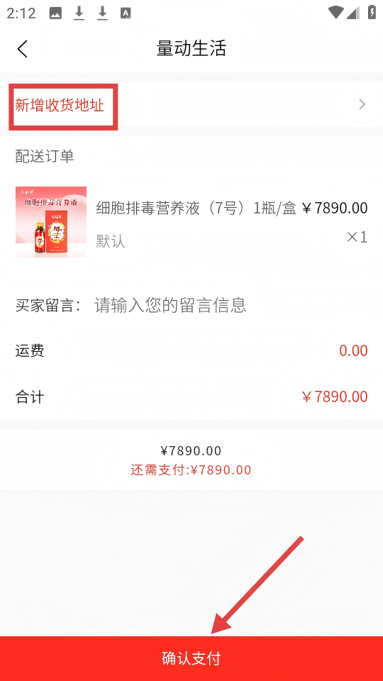4、在订单页面,新增收货地址后,点击【确认支付】按钮。
