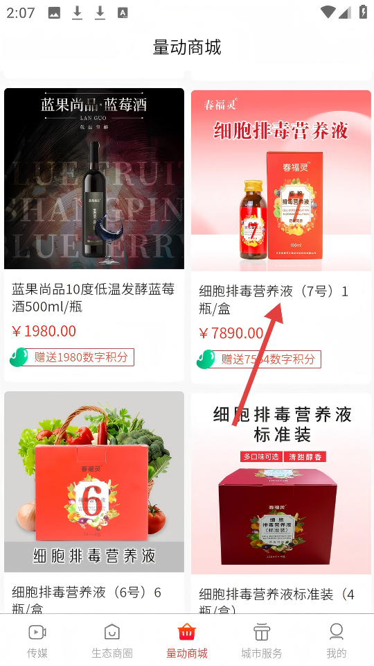 1、在量动商城页面,点击【细胞排毒营养液(7号)1瓶/盒】的商品卡片,进入该商品详情页。