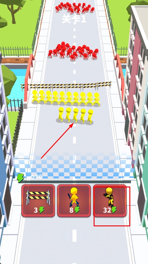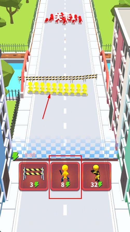 3、投放路障后,选择并投放持棍的黄色小人,让其在路障后抵御红色僵尸。
