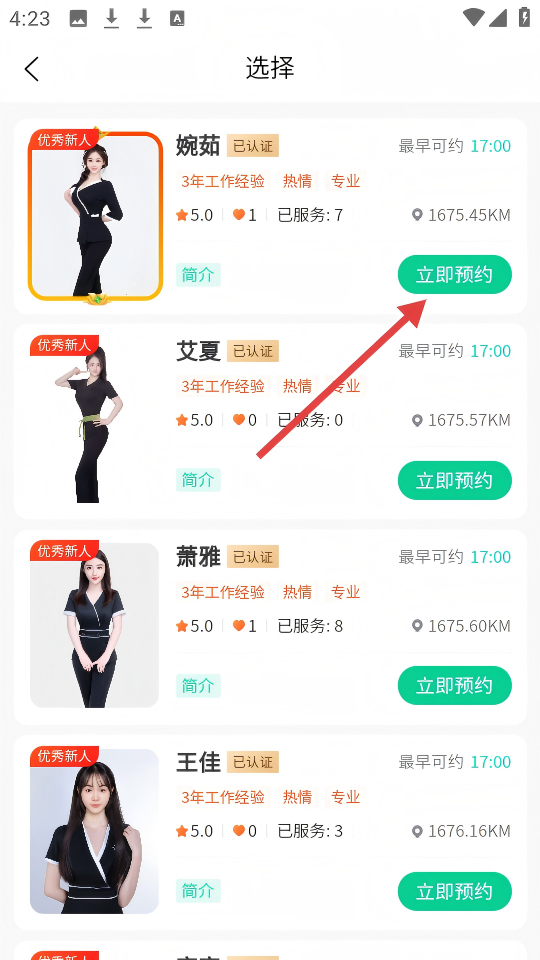 3、在服务人员选择页面,点击对应人员的【立即预约】按钮。