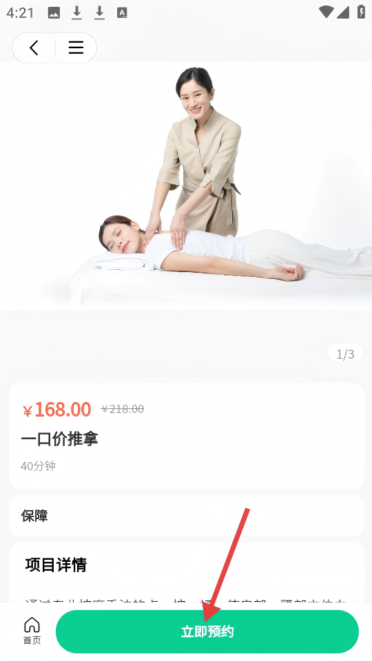 2、在一口价推拿项目详情页,点击【立即预约】按钮。