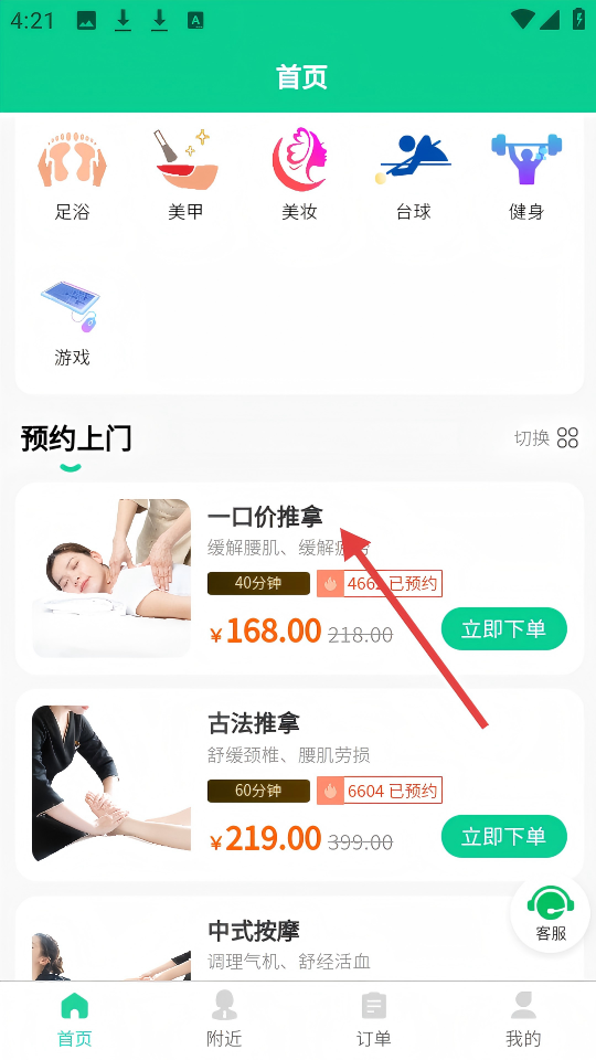 1、在首页预约上门板块,点击【一口价推拿】项目。