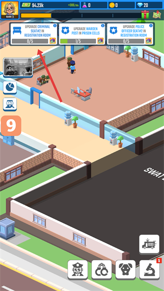 1、关注上方的升级提示,如【UPGRADE-CRIMINAL-SEAT#2-IN-REGISTRATION-ROOM】,点击进入升级界面。