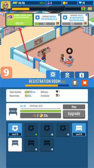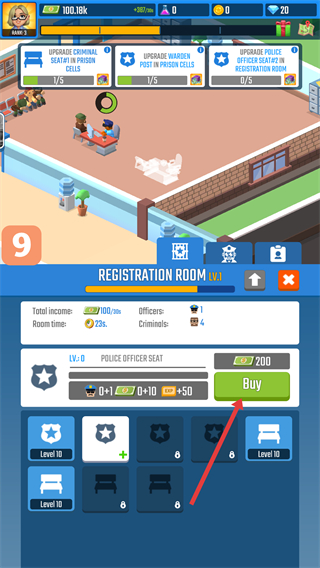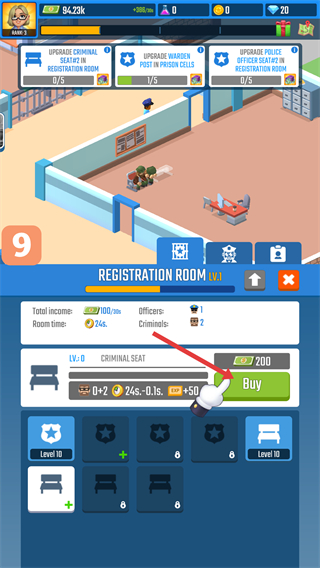 2、在登记室界面,点击【Buy】按钮购买罪犯座位,提升房间容纳和收益能力。