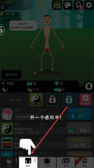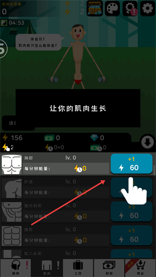 2、花费60能量升级胸部肌肉,让肌肉生长,提升每分钟能量获取,助力后续肌肉升级和技能解锁。