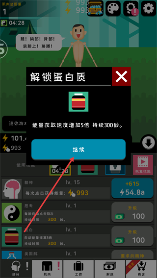 3、点击【继续】按钮解锁蛋白质,可使能量获取速度增加5倍持续300秒,大幅提升能量积累效率。