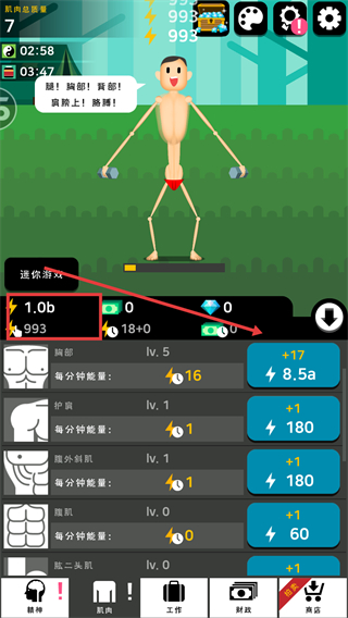 4、持续升级肌肉部位,如胸部、中肌等,提升每分钟能量和等级,结合能量获取加成,加快角色肌肉锻炼和成长速度。